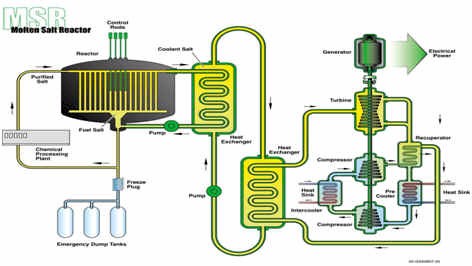 In the core of the Molten Salt Reactor is where fission occurs - within the flowing molten salt which is the "fuel" and is heated to approximately 700° C., after which it flows into a primary heat exchanger where the heat is transferred to a secondary molten salt coolant. The fuel salt then flows back to the reactor core. The clean salt in the secondary heat transport system transfers the heat from the primary heat exchanger to a high-temperature Brayton cycle which converts the heat energy into electricity. The Brayton cycle may use either nitrogen or helium as a working gas.